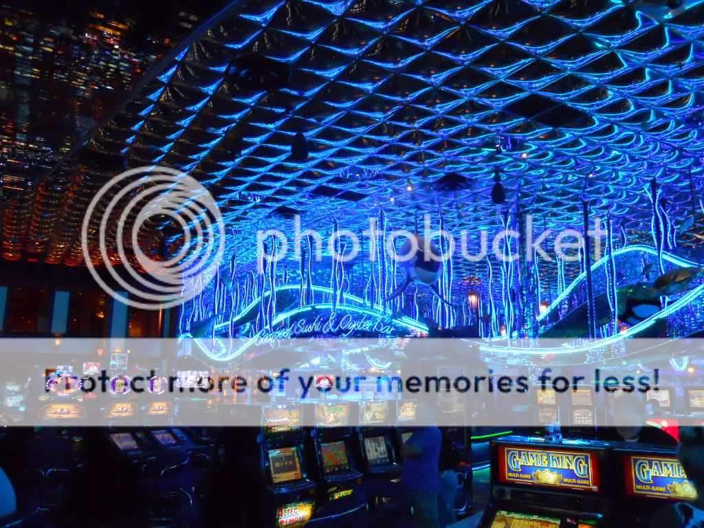 Across the street is the other large hotel/casino in the valley called Atlantis. The one thing that I find interesting here is what they did with the walkway that goes across the street from the parking lot to the casino. They went to the extreme here, and not only put the requisite slot machines, but they also put in a full scale sushi bar and oyster bar. I thought it was a really good use of space and something different. My blackjack bet turned good once again with a win.