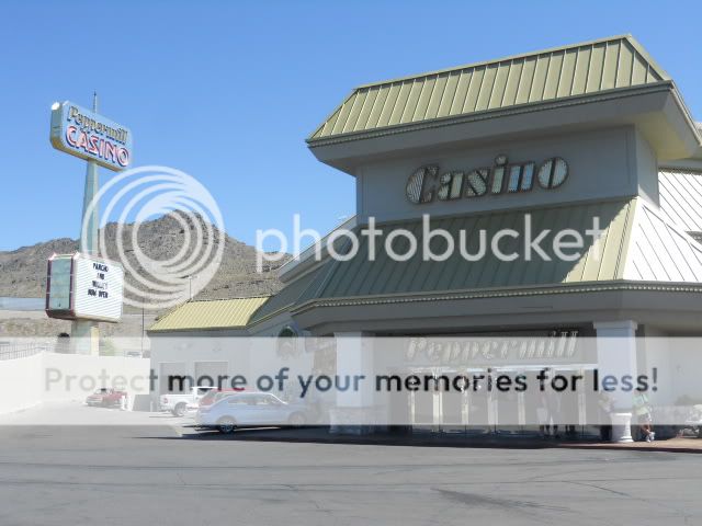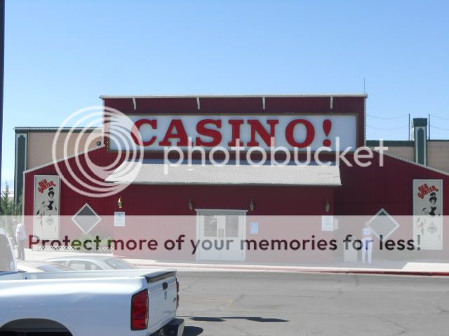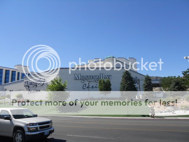 The major purpose of West Wendover is casino industry related. It’s called West Wendover because it sits right at the Utah/Nevada border with the Utah city of Wendover. The state line cuts right through the middle of town much like Lake Tahoe is part California and part Nevada. There are five casinos here, three of which are owned and operated by the Peppermill Corp: the Montego Bay, the Rainbow, and the Peppermill. My first stop, however, was a small casino on the western part of town called the Red Garter Casino and Hotel (motel, really). It’s a two level casino with about a hundred machines and a few tables. I waited patiently for the dealer to shuffle (two deck game), said I only had time for one game. She dealt me a 20 and we tied. She dealt me another 20, and we tied again. She dealt me a third straight 20, then dealt herself a 21. Yeah! -$10.
