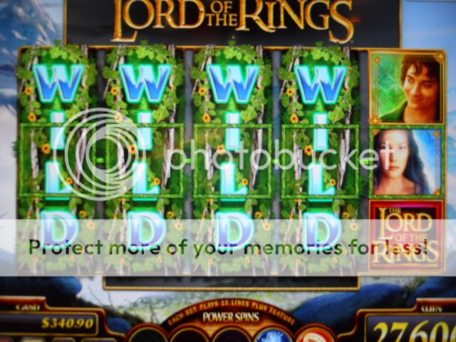I went to check out the machines and played a few and then sat down at a Lord of the Rings machine (no doubt you can tell this is a favorite). My little “system” of playing these is to put in $40 and play eighty cent rounds. I’ll play that until it’s exhausted and then play whatever power spins I had built up and that will be what I cash out (I never play the power spins until I’m out of cash). I’ve found that with a reasonable amount of power spins, that I tend to get back my money and hopefully some profit as well. On this particular session, one of the power spins is a “wild tree” where you usually get one or two of them. Well, today I hit four of them, which is extremely rare and it turned into a sweet profit.