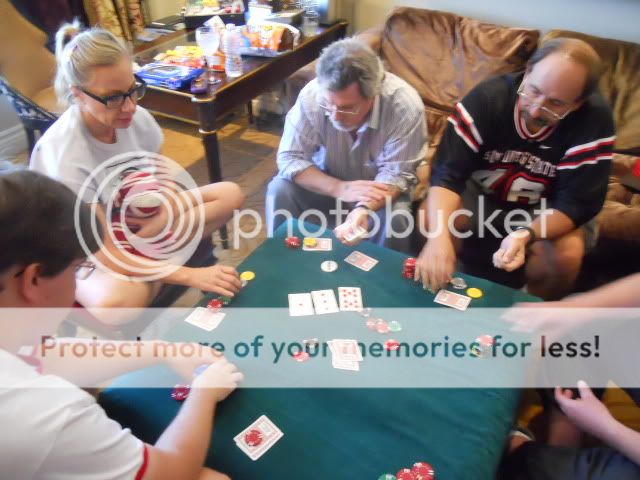 Harve and Bob furnished some booze and snacks and the game got under way. It is always a great time. The idea that once a year you and your friends travel 3,000 miles to the desert in the middle of the summer to play a game of poker in your room. I’ve been honored to have been invited the past couple of years and it’s always a great time. One of the usual players, Todd, couldn’t make it out this year, but he was there via the Internet on a Skype type site and as you can see in the pictures, was giving his advise (through written signs as his audio wasn’t working) throughout the match.