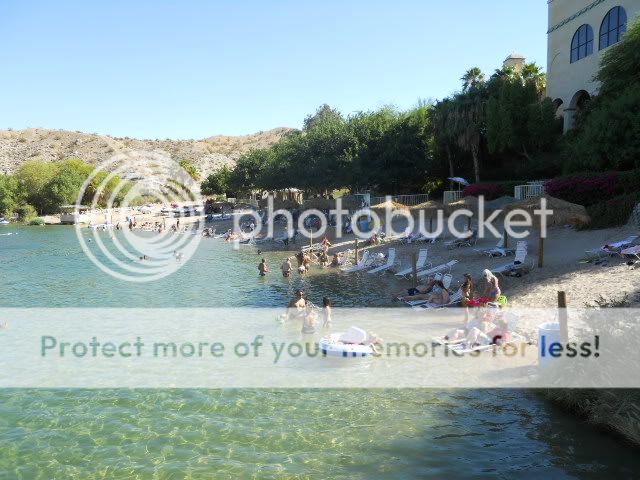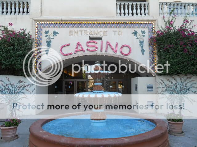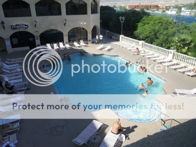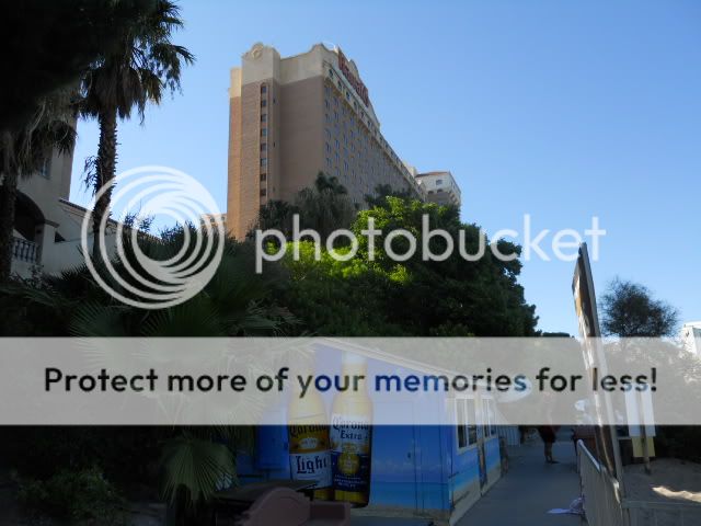 Since I’m not leaving the property today, I thought I’d grab some pictures for this report of Harrahs for those who have not been here. I should mention that it’s 108 degrees today (almost mild for Laughlin in the summer), and how people can hang out in the sun all day in this heat simply escapes me—guess I’m just old. There’s a strange rule they have on the beach here: no coolers are allowed on the beach itself. So, there’s a fence that surrounds the beach area and it’s lined with everyone’s coolers, so if you want a cool drink, you need to run up on the grass around the fence to get it. The only reason I can see for this is the hope that people won’t want to deal with the hassle, and simply leave the cooler at home and buy the drinks from the refreshment stand—sort of the movie theater notion of no outside drinks or food allowed.