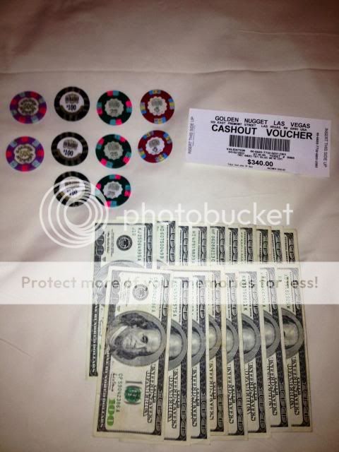 Back at the Nugget the second pit is open so I play Texas Hold Em Bonus and then Crazy Four poker for a few hours and I'm getting lots of the bonus hands. I ONLY play $5 chips on each spot option, but I end up with almost $1,300 profit from the tables and $700 from the Double Diamond machine for the day. The guys at work wanted progress reports so I have pictures of the chips & tickets each day if someone could help me get them posted, I would share.