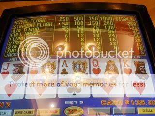 I just used the room packet coupons for extra Panda/Chinese take out food for dinner in the room, and my dad couldn’t be found. I was watching some TV in the room, while enjoying my dinner, and finally around 8:30pm he shows up and shows me 2 payout tickets of $1K and $1k…..Unbelievable. He had hit 2 sets of ducks and 2 Royals at the FPDWs (and 1 by playing wrong! – yes he now gambles and tosses the ‘wild’ RF away if 3 or 4 nat’l to RF. I can see risking the 1 cd draw, but not 2, esp now that only 2 wilds left to redraw for…). Well can’t argue with his luck. He is THE DUCK killer (and Royal Master!) Must be picking up where JMAN and I have spent endless hrs of NOT hitting those royals and deuces on that game….good grief! So his minor -60 beginning just had a +2500 infusion, and he’s got a great start (net of +2200 or so).