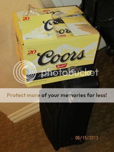 We start to pack up our things and move them over to the Tropicana. Since Sean is in no state to carry his case of Coors Banquet, I try to balance it on my rolling carry-on as we cross the bridge to the Tropicana.