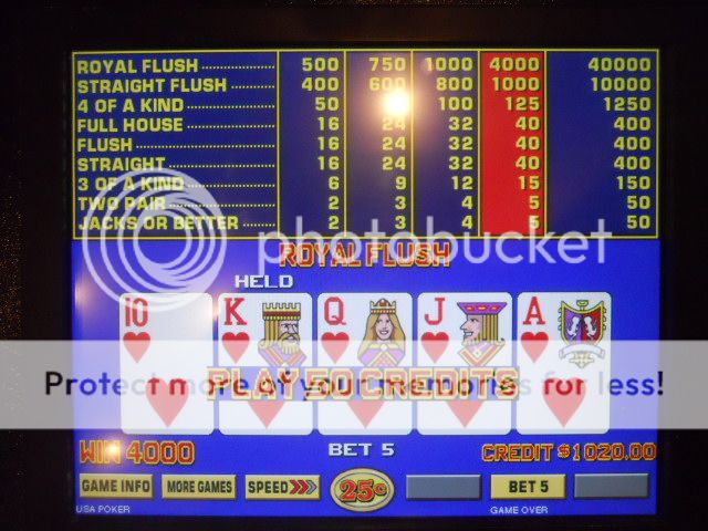 I did spend a few days in Laughlin a couple of weeks ago. Two nights at the Tropicana Express on a three month mailer which allowed me to use three nights per week as many times as I’d like as long as there was a one week gap between uses. This is the third time I’ve used it. The rooms are nothing special, but they’re clean, roomy and have new furnishings including a flat screen TV. The next three nights I stayed at Harrah’s. There was not a tournament, but I had $175 in free play I wanted to use plus catch up on some movies at the Riverside. There’s not a lot to talk about on this trip except that when I was walking from casino to casino and playing $20 per casino, I was in the Laughlin River Lodge (previously River Palms and now owned by the Dotty’s franchise) and was playing All-American poker (also known as USA poker) as I had my WinPoker app and checked strategy on almost every hand. I held one King of hearts and up popped the other four for my first quarter Royal of the year (we call this type of hit a Louise). As a nice plus, the winnings were on the machine, so no hand pay. I hit this on my first day, so it pretty much assured a nice frame of mind for the trip. I spent most the days watching movies and playing live poker at the Colorado Belle, where I did fairly well.