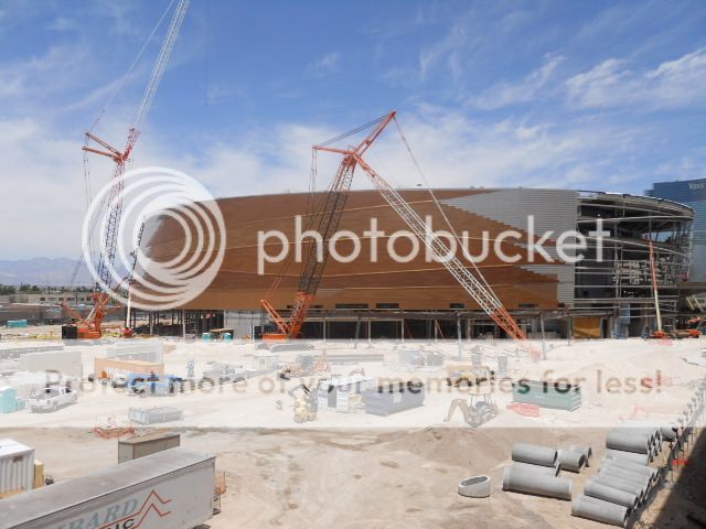 Today I decided to check out the southern part of the Strip. I haven’t really spent any time there in perhaps a year or so and thought it would be nice to see what, if anything has changed. Besides, I plan on using the MYVegas gold coins to see Zumanity at New York, New York, which I have seen before, but the first year it opened and I’m sure things have changed a bit since then. I pulled into the parking lot of NYNY and called the number on the web site, which sets up your booking confirmation. There are two numbers, an 858 and a 702. I called the 858 number and was put on hold…I waited for just over an hour listening to music and hearing that obnoxious message “Thank you for your call, all our representatives are currently with other customers, please hold as your call is very important to us.” Right…I became really frustrated after the hour mark and finally hung up figuring I just won’t go to the show. I’m here at NYNY because once you confirm your reservation; you have to pick up your tickets at the box office before 4PM. While waiting in the parking lot, I walked to the back where they are building a sports arena. I was here just a couple of months ago and there was nothing to be seen here and now, the entire outer building is almost up as you can see in the picture.