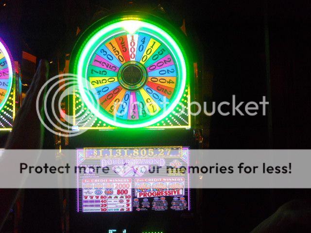 We walked over to the Cromwell where they showed me their room and then we picked up some free play coupons for $10 each and got the vouchers for the show. We walked over to Harrahs to the box office and picked up the tickets for the show. Big Elvis was playing to a packed audience in the lounge as we headed back to the Flamingo where we stopped in the Diamond Lounge for another drink. The food offered was—get ready—chicken wings along with corn on the cob. After a while and a nice chat we headed back to the Cromwell to use the free play tickets. I suggested that we pool the $40 (I had an extra $10 from another coupon) and play an old school $5 slot machine. The Cromwell didn’t have any so we settled on the two-coin version of the $1 Wheel of Fortune. We took turns playing and were down to $15 and Julie asked if we should take that and at least have five dollars each. Dave said, “Nah, good big or go home.” We were down to $5 and our last spin. Julie played and the SPIN disc can up. We all put our hands on the spin button together and pressed—and would you believe it? We hit the $1000 win. It was so surprising. After some high fives and pictures, we cashed out, went to the cashier and split it three ways. Sweet.