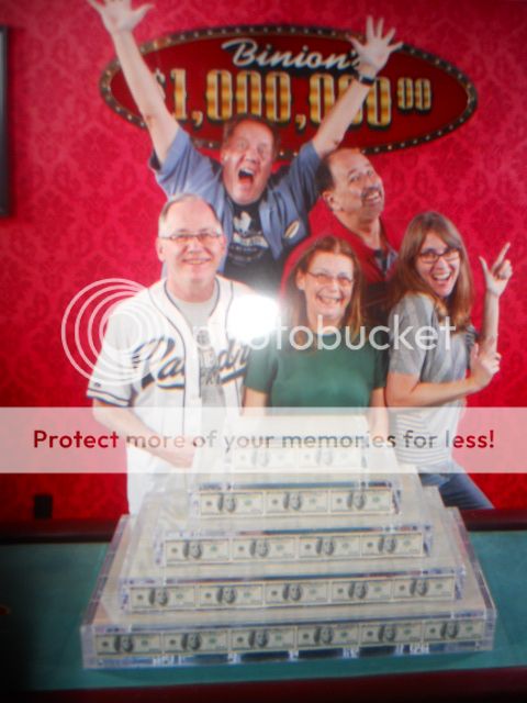 We walked over to Binions for dinner. Dave and Julie had a $100 gift certificate for the steakhouse and the three of us chose to eat at the bar in the back where they service GREAT BBQ ribs and chicken. We of course, stopped for a pic with the million dollar display. We all sat at the bar to order our food and Dave and Julie joined us as they had a few minutes before their reservation time. They played the bar tops and Dave was dealt quad deuces (no kicker) for a fast $200 more than recouping his blackjack losses. If you like BBQ, I highly recommend this place (located in the back of Binions). The half rack is only $9.99 and the sides of corn bread, beans, and cole slaw are amazing!