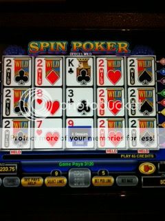I played some more Spin Poker but this time I went for the 7/5 Bonus poker (yes, short pay, but I was “feeling it”). I played for almost two hours going up and down but pretty much staying in my $100 initial investment when I was dealt four 7s. I cashed out and then dropped $40 on a couple of stupid penny games (I’ll never learn).