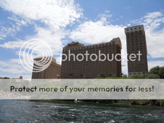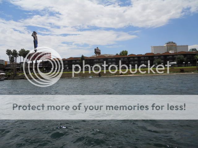 Cindy was getting tired, so we decided to end the tour here and head back to Harrahs. We backtracked to the Colorado Belle and picked up the water taxi. I was able to take a couple of pictures of the hotels from this perspective. The beaches along the way were crowded with people enjoying the water without the oppressive heat. After returning to Harrahs, Cindy wanted to nap, so I took on the casino. For the next hour, I took my swings at Jacks or Better, and three or four penny machines. After adding on another couple hundred points ($2K in play), I ended the session down only $20. Again, the Royal continues to elude me this trip.