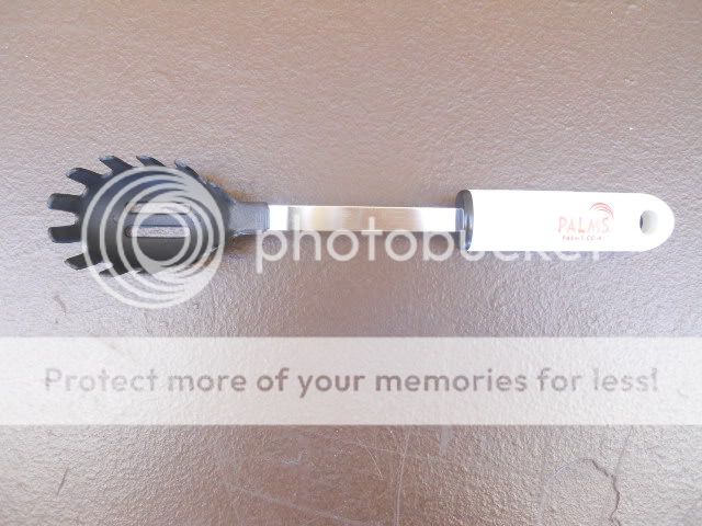 Things weren’t done. Not long after that, holding only two cards I caught my 6th 2-cent royal. Not long after that—holding three cards, another royal and finally, a third royal—the 8th 2-cent royal of the trip. I was never dealt four-to-the-royal nor any other good hits or decent dealt cards. The machine went dead cold (they all do) and I lost a hundred and quit. All told, I made a $350 profit from our good friends at the Palm. I then went to swipe my card for the Senior promotion. In years past, there were logo mugs, bath towels, non-stick pots and pans, hats, shirts…this time my big win was a spaghetti grabber.