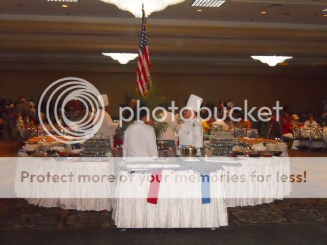 I walked down to the convention center and there was already a long, long line of people waiting to go; however, that didn’t prove to be problem. There were four different buffet tables and bars throughout the place. They had what you’d expect on a Fourth of July. There were BBQ ribs and beans, corn on the cob, salmon, four or five different choices of salad, fruit, and a hamburger and steak station. The food was excellent. They also had a dessert station in the middle with apple, cherry, and boysenberry pies along with ice creams and toppings. All in all it was very well organized and everyone seemed to have a good time.