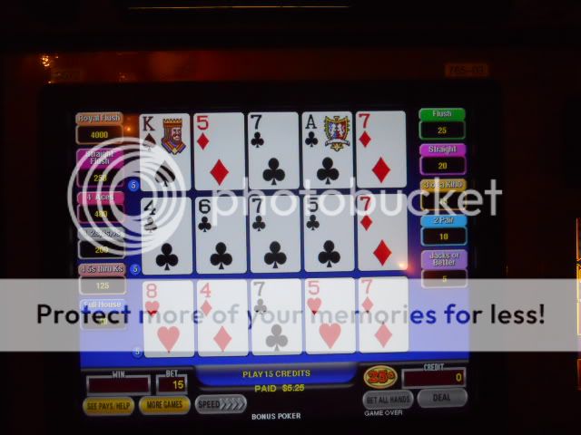 I parked in the garage and walked in to the familiar smell of peppermint, which reminds of the scent they pipe into the Flamingo in Vegas as well. After looking around for bit, I did find a triple/5-play/10-play All Star poker machine that did have 8/5 Bonus poker for quarters. Here’s pic of it for you.