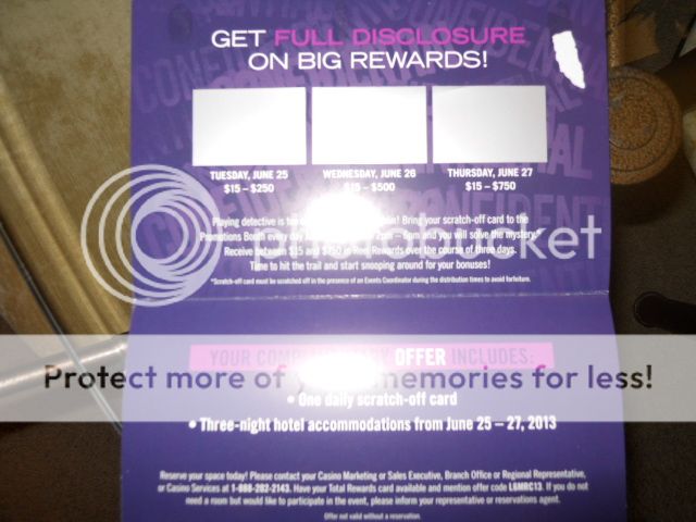 My stay this time around is for three nights. The promotion is called the Mystery Box, which on the post card sent to me announcing the promotion, there are three boxes covered in silver, very much like a scratch off lottery ticket. The box must be scratched off in front of the promotions person that day. Tuesday the box is worth $15 to $250; Wednesday’s box is $15 to $500 and Thursday’s box $15 to $750.