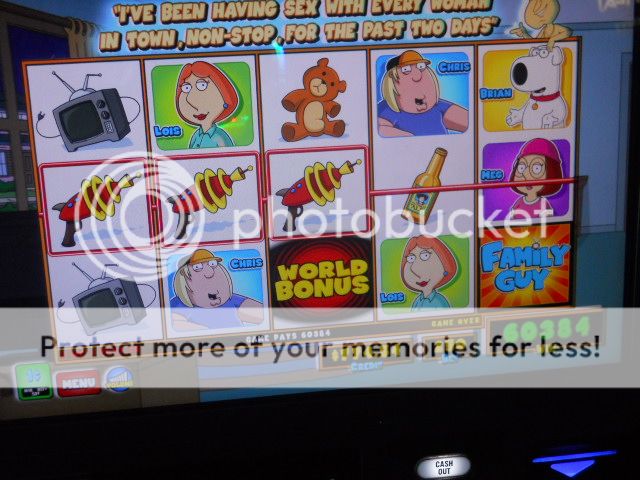 We spent a good hour enjoying the food, the conversation, and the drinks in the Diamond Lounge and I started to run out of gas. (My timeline might be a little screwy her—Cadillac margaritas are to blame) We walked back to the Mirage where we ran into Tennis Bum and Noahcat, who was playing the new Family Guy video machine. As we were walking up, she was raking in the money having just hit three of the progressives—sweet!