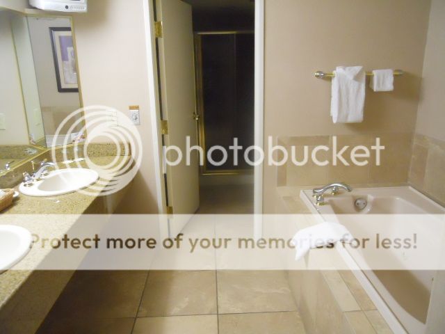 The bathroom area: double sinks, Jacuzzi style tub, a TV in the mirror, and shower