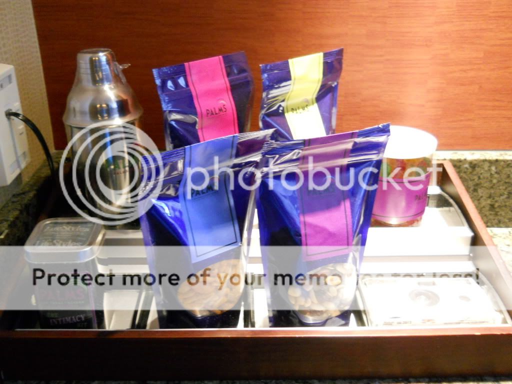 Headed back to the IP, packed up our stuff and made the long trek to the self parking area. Simple drive and in minutes we were at the Palms. I love the Palms, and will always stay there, especially when the rooms are free and they are giving me free play and show tickets. Check-in was great and we were given a room on the 16th floor of the Fantasy Tower. Unpacked and checked out the room. My wife got a kick out of the mini-bar.