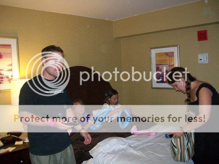 Our dingy and dated (but free) Flamingo room. The characters at Margaritaville made them these balloon creations...