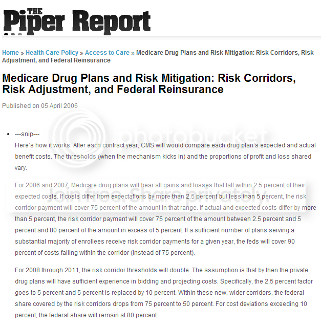 ...Obamacare also contains a “Risk Corridor Program" that limits overall losses for insurers. Each year the insurer estimates his expected costs. If the actual costs exceed the estimates the Government [read: taxpayers] make up the difference. For costs 3%-to-8% above the estimate, the Government [read: taxpayers] pays 50% of the excess; for costs 8%-or-more above the estimate, the Government [read: taxpayers] pay 80% of the excess...