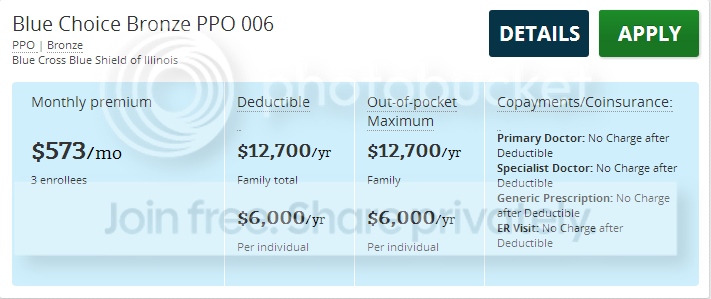 And at healthcare.gov: Family Coverage >> Health >> Illinois >> Cook or Du Page counties >> Person #1 age: 54 >> Person #2 age: 53 >> Person #3 age: 19 >> No employer health coverage available >> $100,000 income (no subsidy available), the OBAMACARE price: