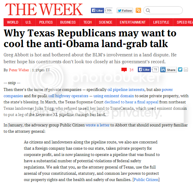 If Bundy's gun fondlers decide to give up on the freeloader, they can always go down to Texas. It turns out the Republicans down there are confiscating ranch land on behalf of FOREIGN CORPORATIONS. Let freedom ring!