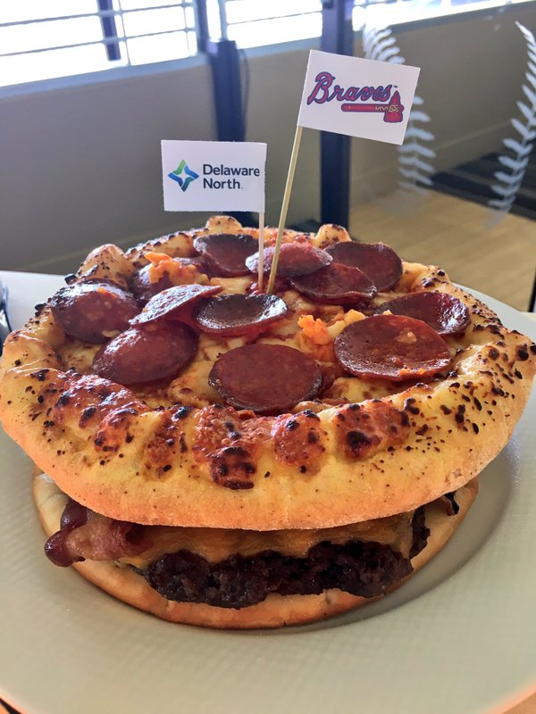 You start with an eight inch cheese pizza. Add three slices each of cheddar and bacon. Place a twenty ounce beef party, another three slices of bacon and cheese and top it all with an eight inch pepperoni pizza.