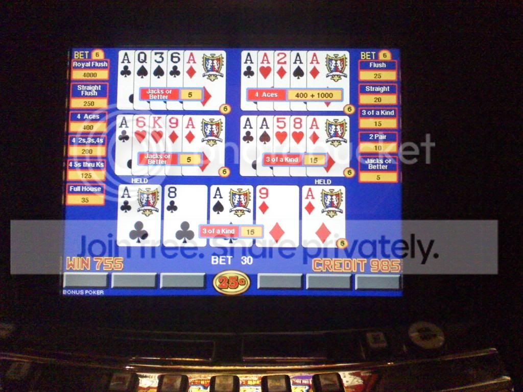 I picked up four aces on 25 cent Bonus Poker 5-play for 100 bucks plus 1000 more coins on the wheel spin