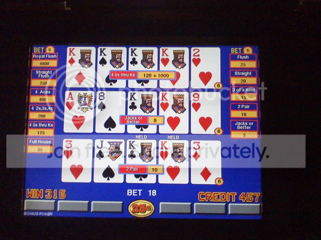 I cashed out 300 bucks, and put another 20 in this machine, while LF went to cash out my ticket for me. I played 3-play bonus poker, and hit this beauty