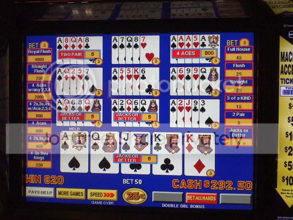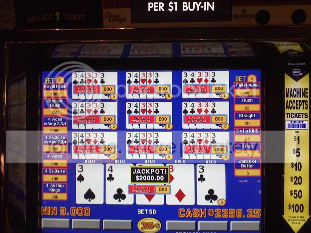 I pulled a 100 out of my wallet, and left LF playing 4-card keno, to go play a 25 cent wheel poker machine. I had noticed earlier that some dude was playing this machine and getting lots of quads and subsequent wheel spinners!