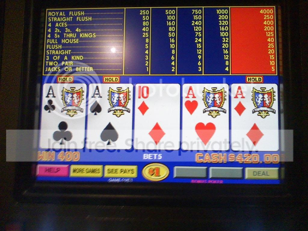 She got 4 Jacks within a few hands, then 4 tens. Cashed out 200 bucks. I gave her another 40 and she hits quad 4's for another 200 bucks. I gave her another 40 and she hit quad 5's and 7's for another 200 bucks! I was still playing on my first 40 bucks on this machine. I got up to 140, and back down to 30 bucks, twice, and could not get over that 200 buck mark, for my cash out!!
