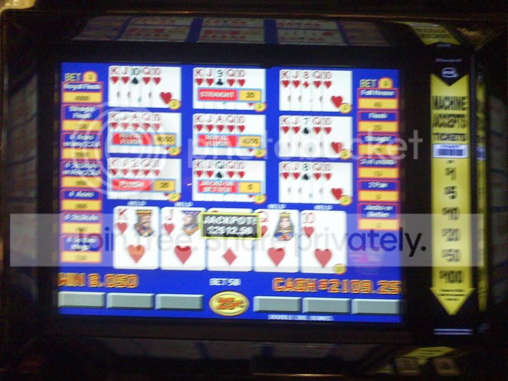 Well I told her what had just happened, and how I built up from 9 bucks back over 100, when I get dealt 4 to the royal in hearts. I held all 4 cards, and held my breath and BOOM!!!