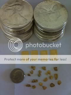 Just curious as to what others might collect, whether it be comics, coins, baseball cards, beanie-babies, etc. These are some of my collection, Silver American Eagles (1 oz. fine silver), 1 gram gold bars (I bought these out of the vending machine at Golden Nugget Las Vegas, $63 each), and small gold nuggets.