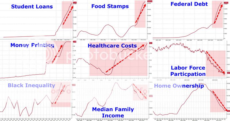 Oh, poor old DonDiego did provide the explanation of the red color in the original posting; red represents the Obama Years. The arrows indicate the direction of change during those years.