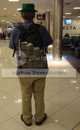 Our flight out was a red-eye, so we used up time going to several Sportsbooks again and then went to Boulder Station for dinner and watched "Apollo 18" at the theater there. For the trip back, DonDiego carried our laptop and his gambling paperwork in his brand-new 'money' backpack....just wish it was filled up with the real stuff!