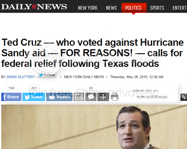 Ted Cruz was critical of the emergency relief for the Northeastern states because only 30% of the authorized funds would be spent in the first 20 months, and over a billion dollars would be spent as late as 2021. It's not 'emergency relief' if it's taking almost 10 years to spend it; it's just pork. Even Politifact conceded that the Hurricane Sandy emergency relief bill contained billions of dollars that had nothing to do with emergency relief.
