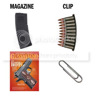 Clip vs. MagazineYou know that boxy rectangular thingy that holds cartridges and slides into the bottom of your semi-auto pistol? It’s not a clip — no matter how often the term is misused. It’s a magazine.