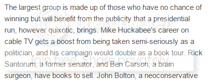 Since the conservative media is so large, running for President as a Republican candidate is very lucrative. You get books deals, cable TV shows and of course the ability to raise funds. Even a nominal figure like Ben Carson or a person whose political career is over like Rick Santorum can milk the conservative money machine instead of having to get a real job.