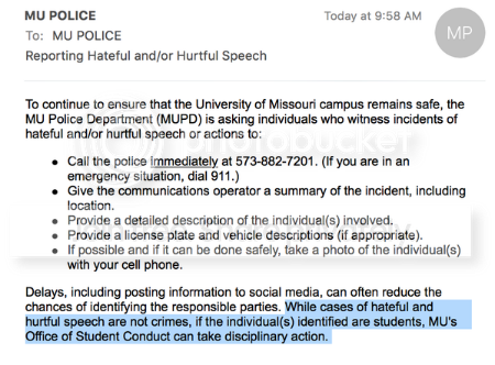 The University of Missouri police department has sent an email to all students advising them to call the police if they witness any incidents of “hurtful speech":