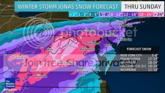 Below is today's [19 Jan] forecast for snowfall accumulations over the upcoming weekend from Winterstorm Jonas.