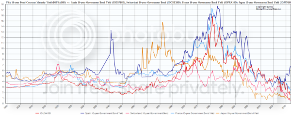 This is a chart of 10-year-bond rates in 5 Countries from 1900 until 2012; the dark-red line is the USA. The rate in 2012 was about 3.5%; today is 1.75%: