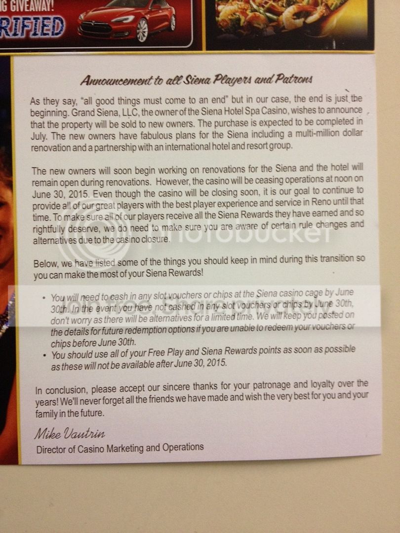 We went to Sienna for the first time in April--seemed like a nice casino. I got $20 on a spin as a new member--about my biggest win on that trip by the way. Always sad Yosef a casino close.
