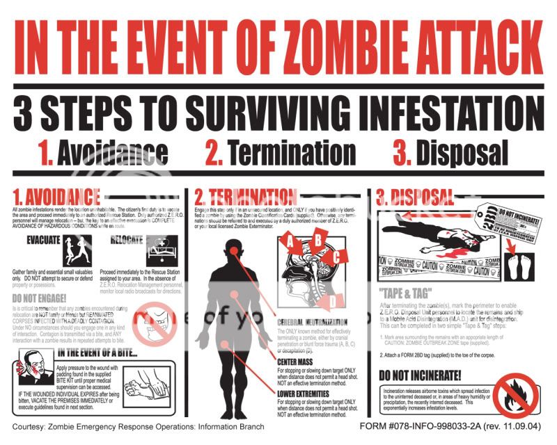 Quote Originally posted by: DonDiego The US Government Centers for Disease Control and Prevention (CDC) offers Emergency Preparedness and Response advice for the Zombie Apocalypse .