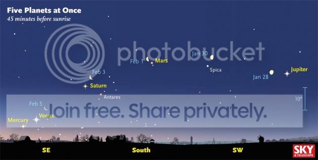 Oh, . . . the chart above also includes the position-and-phase of the Moon at several dates over the next month, the less-full the Moon the easier to spot the planets. And the position of the Moon on February 5th would make it easier to spot mercury.
