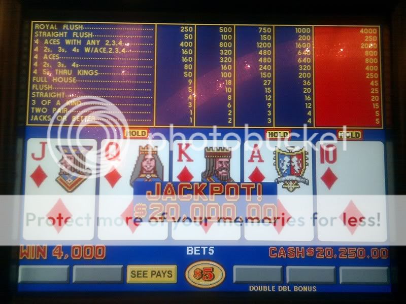 And I said to myself... she's on my RIGHT and she will hit a royal. Well, at first I thought my machine was another set to off. I went through one thousand dollars that I had in my wallet and then asked a floor person for a $2,000 marker. As the floorperson walked to get my marker... I got it. A royal for $20K. I was dealt three to the royal. A $20K win.