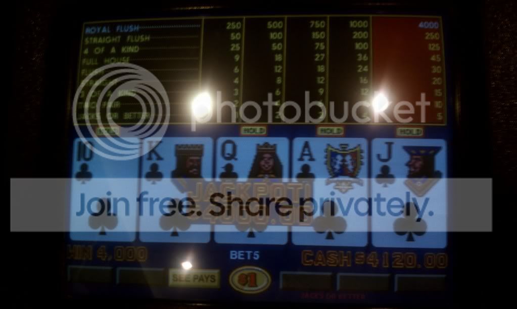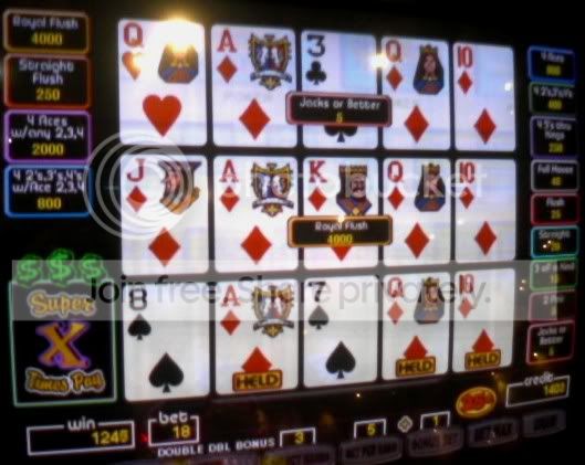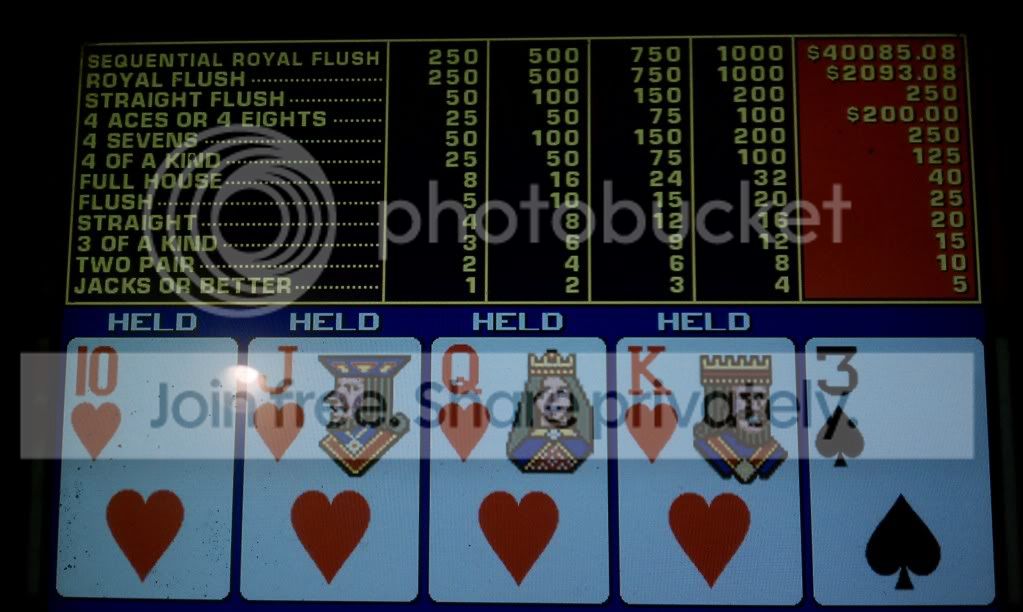 This is an Aces & Eights game that's .50 denom single line with a progressive for the sequential and regular RF. The sequential is worth $40K! I'm playing along and get dealt this hand:
