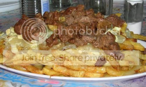 Chorrillana - "A popular Chilean dish consisting of a bed of french fries topped with sauteed beef strips and onions with two fried eggs"
