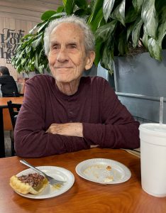However, with the world getting back to the “new normal” and casinos “finding” my Georgia address (casinos do this better than the USPS!), the mail offers returned and I got a particularly good one from Harrah’s Tahoe, with airfare credit to help with the unbelievably high fares and a good amount of free play to nudge it toward positive territory. Angela and Steve knew I needed a break from caregiving duties and offered to keep Brad. I was a little anxious about this; he’s used to my always being around, but he did okay. Angela texted this picture to reassure me while I was gone, taken at a buffet he likes where he’s enjoying his favorite dessert, pecan pie.