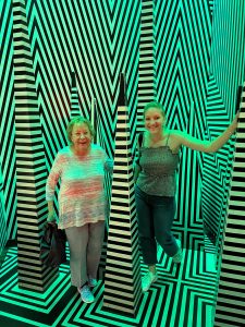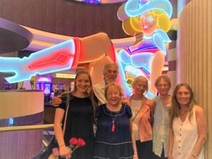 Next we played a little roulette on the stadium option. Rows and rows of machines face a screen where you can play video blackjack, craps, baccarat, and roulette. Susan’s son had asked his mom to put $50 for him on black. It took a few hands to figure out how to play our machine, but she finally won $35 to take back to him.