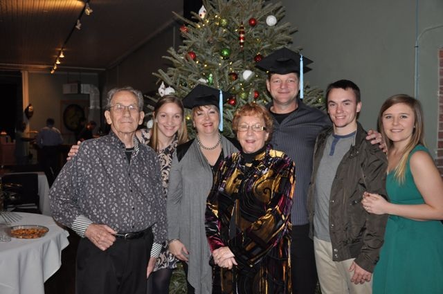 Then came the graduation party last night for Angela and Steve, who after starting their college studies some 25+ years ago both finally got their BS degrees. With 50+ of their friends and their kids’ friends we celebrated with dinner and a DJ orchestrating lively dancing and hilarious karaoke. The picture above shows the family just before the party started, before Brad and I were panting after dancing to “Rocky Top.” The next ones were taken later.