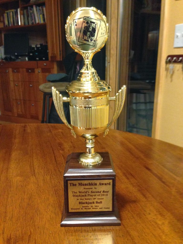 The final round was Count and Play. Each player was given one deck out of a double deck game. They had to count down the deck, then slap the table, and announce the count. If correct they would then play a hand from the remaining cards of the double deck, and may or may not have to use an index play based on the count they had just done. I should point out that 30 years ago Darryl was known as the fastest counter in the world. so fast that he won several large bets, and Ken Uston wrote about him in his books. BUT, Darryl also hasn’t counted cards in over 20 years. Still, I guess some things never leave you and Darryl smoked “Smoke” and beat him by over 10 seconds. Anthony Curtis was counting over Darryl’s shoulder and later said to me, “Jesus, I couldn’t keep up with him.” Darryl announced his count as +3 which was correct. Now all he has to do is play a hand from the remaining deck, and he wins. As I mentioned it is a double deck with Barona rules. Darryl gets 15 vs. 9. Aha! Remember Max said, “You may or may not have to use an index number.” What is the number to stand for 15 vs. 9? The index is plus 4, but the TC is only plus 3. Darryl hit his 15, and caught 4. But then Max flipped his hole card and revealed an ace! What happened??? Yes, the number to stand with 15 vs. 9 is +4, but the number for surrender is +3. Barona has surrender on their double decks! So Darryl lost because he didn’t know the rules at a casino he isn’t allowed to play at. Oh the humanity! But he took it like a champ, and if I do say so myself, he did get the better trophy.